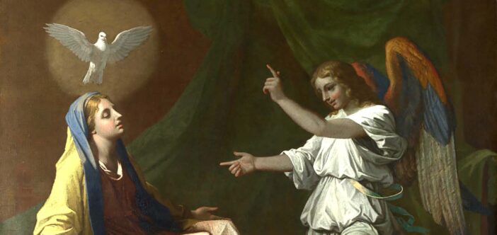 Trình thuật Tin Mừng Luca 1,26-39 kể lại ngày thánh ấy bắt đầu bằng cuộc hành trình tìm đến thành Nazaret của sứ thần Gabriel gặp một thiếu nữ Sion tên Maria. Sứ thần đã loan báo điều Thiên Chúa phán truyền và mời gọi người con gái ấy tham dự vào ý định của Người. Mang đầy nét nữ tính và dịu dàng, Mẹ lắng nghe tất cả trong sự chăm chú, tiếp nhận thánh ý và trao đổi những điều chưa hiểu nơi đường lối Chúa. Với thân phận người con trong lòng dân Thánh, Mẹ cùng dân tộc mình mong đợi Đấng Cứu Thế sẽ đến và cứu vớt Dân Người.