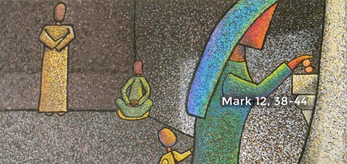 Scripture: Mark 12:38-44 38 And in his teaching he said, “Beware of the scribes, who like to go about in long robes, and to have salutations in the market places 39 and the best seats in the synagogues and the places of honor at feasts, 40 who devour widows’ houses and for a pretense make long prayers. They will receive the greater condemnation.” 41 And he sat down opposite the treasury, and watched the multitude putting money into the treasury. Many rich people put in large sums. 42 And a poor widow came, and put in two copper coins, which make a penny. 43 And he called his disciples to him, and said to them, “Truly, I say to you, this poor widow has put in more than all those who are contributing to the treasury. 44 For they all contributed out of their abundance; but she out of her poverty has put in everything she had, her whole living.” |