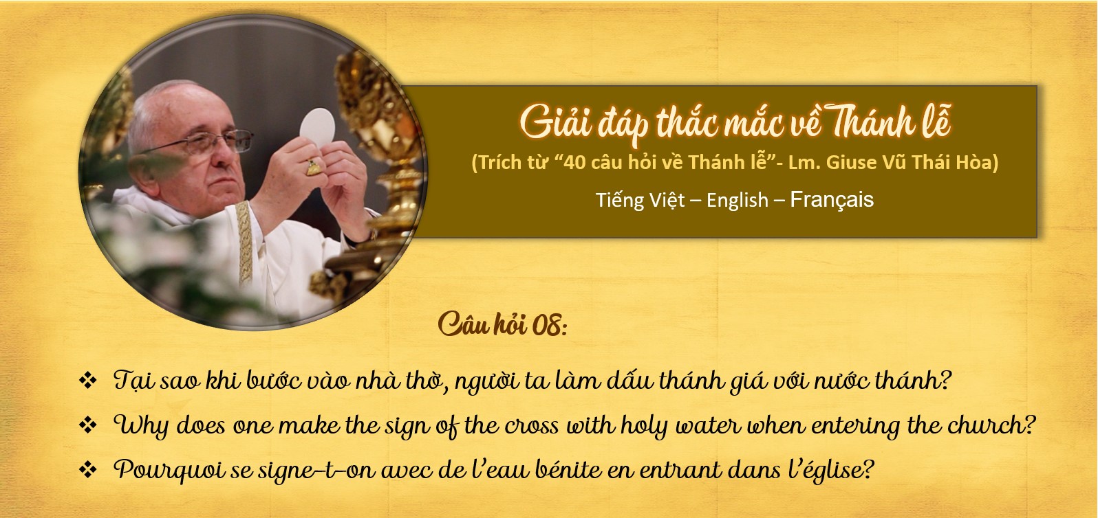 Được sự cho phép của Linh mục Giuse Vũ Thái Hòa, giáo sư Phụng vụ và là tác giả cuốn “40 câu hỏi về Thánh lễ”, Ban Truyền thông sẽ lần lượt đăng các câu hỏi và lời giải đáp cho những vấn đề mà nhiều người vẫn thường thắc mắc về Thánh lễ, nhằm giúp chúng ta hiểu hơn về những cử hành Phụng vụ mà chúng ta đã từng tham dự. Các câu hỏi và giải đáp này sẽ được đăng bằng ba ngôn ngữ: Tiếng Việt, English và Français để các bạn trẻ ở nước ngoài cũng có thể đọc được.