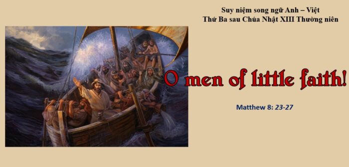 Suy niệm: Chúng ta chống lại sự sợ hãi với đức tin như thế nào? Sự hiện diện của Đức Giêsu đang ngủ khi biển cả nổi sóng gió bão táp cho thấy đức tin đang ngủ của các môn đệ (Mt 8,25). Họ lo lắng cho mạng sống của họ, thậm chí ngay khi Chúa và Thầy của họ đang ở với họ trên thuyền. Đối với Đức Giêsu Kitô họ đang ngủ và Người xuất hiện trong giờ phút khẩn cấp của họ. Tại sao anh em sợ hãi? Chúa luôn luôn hiện diện với chúng ta. Và trong thời gian chúng ta bị thử thách, Người hỏi chúng ta cùng một câu hỏi: Tại sao các con sợ hãi? Các con không có đức tin sao (Mt 8,26)? Bạn có nhận ra sự hiện diện của Chúa với bạn, đặc biệt khi bạn gặp sóng gió của nghịch cảnh, đau khổ, buồn phiền, và cám dỗ không? Bất cứ khi nào chúng ta gặp vấn đề, Thiên Chúa ở đó với cùng một sứ điệp an ủi:“Chính Thầy đây, đừng sợ” (Mt 14,27). Đức tin được nuôi dưỡng bằng lời Chúa Những đặc tính của đức tin là gì và làm sao chúng ta có thể lớn lên trong nó? Đức tin là ân huệ hoàn toàn nhưng không mà Thiên Chúa ban cho chúng ta. Việc tin tưởng chỉ khả thi bởi ơn sủng và sự trợ giúp của Chúa Thánh Thần, Đấng đánh động tâm hồn và mở mắt tâm trí để hiểu và đón nhận chân lý mà Thiên Chúa mặc khải cho chúng ta. Đức tin giúp chúng ta quan hệ với Thiên Chúa cách đúng đắn và tự tin, với sự tin cậy và tín nhiệm, bằng việc tin và gắn bó với lời của Người, bởi vì Người hoàn toàn xác thật và đáng tin cậy. Nếu chúng ta muốn sống, lớn lên, và kiên vững trong đức tin, thì nó phải được lời Chúa nuôi dưỡng. Hãy để tình yêu của Đức Kitô cai trị lòng trí bạn Sự sợ hãi không làm chúng ta tê liệt để làm điều đúng hay cướp khỏi chúng ta sự tin cậy và tín nhiệm vào Thiên Chúa. Lòng can đảm hợp tác với đức tin giúp chúng ta đón nhận lời chân lý và tình yêu của Thiên Chúa với sự tin tưởng và hành động với niềm hy vọng vững vàng vào những lời hứa của T.Chúa. Tình yêu của Thiên Chúa củng cố chúng ta trong đức tin và tin cậy nơi Người và giúp chúng ta hành động theo công lý và nhân hậu với tha nhân, ngay khi đối diện với sự chống đối hay thiệt hại. Bạn có để cho tình yêu ĐGK cai trị tâm trí bạn và đánh động ý chí bạn chọn lựa những gì tốt lành theo ý Người không? Lạy Chúa Giêsu, xin gia tăng đức tin của con vào tình yêu cứu độ và sức mạnh của Chúa để con luôn luôn nhận ra sự hiện diện liên lỉ của Chúa với con. Xin ban cho con lòng can đảm và sức mạnh để đương đầu với mọi khó khăn, thử thách, và cám dỗ với sự tin cậy vào sự trợ giúp cứu độ và sự hiện diện hướng dẫn của Chúa. |