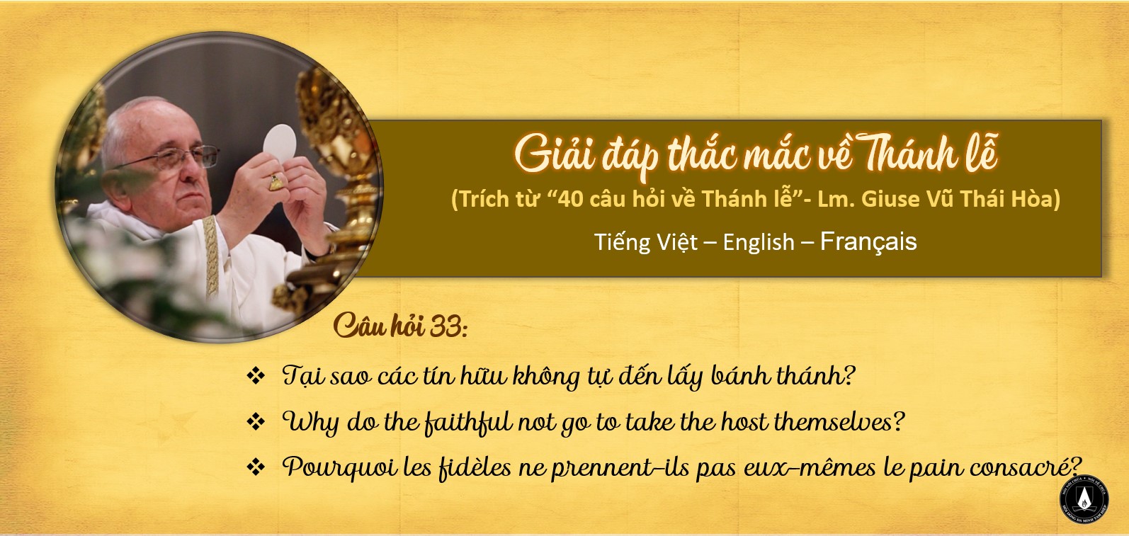 Được sự cho phép của Linh mục Giuse Vũ Thái Hòa, giáo sư Phụng vụ và là tác giả cuốn “40 câu hỏi về Thánh lễ”, Ban Truyền Thông sẽ lần lượt đăng các câu hỏi và lời giải đáp cho những vấn đề mà nhiều người vẫn thường thắc mắc về Thánh lễ, nhằm giúp chúng ta hiểu hơn về những cử hành Phụng vụ mà chúng ta đã từng tham dự. Các câu hỏi và giải đáp này sẽ được đăng bằng ba ngôn ngữ: Tiếng Việt, English và Français để các bạn trẻ ở nước ngoài cũng có thể đọc hiểu được.