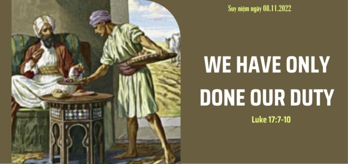 Chúng tôi chỉ làm tròn bổn phận của mình Lc 17,7-10 7 “Ai trong anh em có người đầy tớ đi cày hay đi chăn chiên, mà khi nó ở ngoài đồng về, lại bảo nó: “Mau vào ăn cơm đi”,8 chứ không bảo: “Hãy dọn cơm cho ta ăn, thắt lưng hầu bàn cho ta ăn uống xong đã, rồi anh hãy ăn uống sau! ?9 Chẳng lẽ ông chủ lại biết ơn đầy tớ vì nó đã làm theo lệnh truyền sao?10 Đối với anh em cũng vậy: khi đã làm tất cả những gì theo lệnh phải làm, thì hãy nói: chúng tôi là những đầy tớ vô dụng, chúng tôi đã chỉ làm việc bổn phận đấy thôi.” |