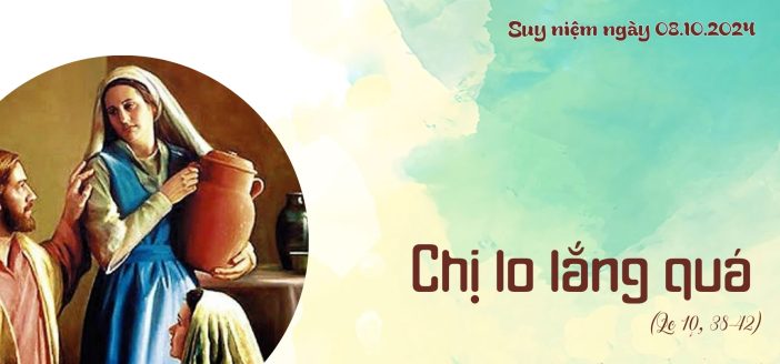 Chị lo lắng quá Lc 10, 38-42 38 Trong khi thầy trò đi đường, Đức Giê-su vào làng kia. Có một người phụ nữ tên là Mác-ta đón Người vào nhà.39 Cô có người em gái tên là Ma-ri-a. Cô này cứ ngồi bên chân Chúa mà nghe lời Người dạy.40 Còn cô Mác-ta thì tất bật lo việc phục vụ. Cô tiến lại mà nói: “Thưa Thầy, em con để mình con phục vụ, mà Thầy không để ý tới sao? Xin Thầy bảo nó giúp con một tay! “41 Chúa đáp: “Mác-ta! Mác-ta ơi! Chị băn khoăn lo lắng nhiều chuyện quá!42 Chỉ có một chuyện cần thiết mà thôi. Ma-ri-a đã chọn phần tốt nhất và sẽ không bị lấy đi.” |