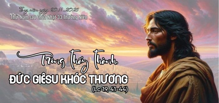 Trước hết, chúng ta hãy nhìn ngắm “Đức Giêsu khóc thương” và để cho mình được đánh động: Khi đến gần Giêrusalem và trông thấy thành, Đức Giêsu khóc thương. (c. 41)