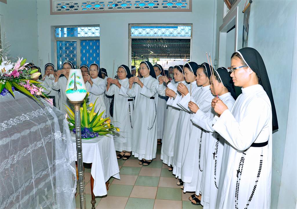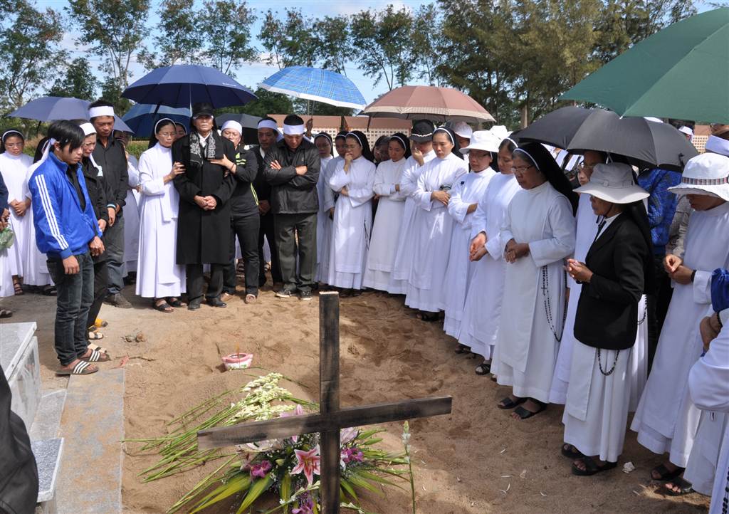 Sau Thánh Lễ, chị em cùng tiễn Bà Cố đến nơi an nghỉ cuối cùng và ở lại đọc kinh, cầu nguyện và chia sẻ nỗi mất mát đau thương với gia đình cho đến khi mộ phần được lấp xong.