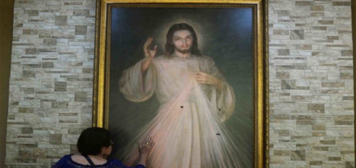 Ngày 20 tháng Bảy các tín hữu cầu nguyện trước ảnh Lòng Chúa Thương Xót bị những lỗ đạn xuyên thủng trong một cuộc tấn công của các lực lượng chính phủ tại Nhà thờ Divina Misericordia ở Managua. Ngày 14 tháng Bảy các sinh viên của Đại học Autonomous của Nicaragua đã lánh nạn trong nhà thờ suốt thời gian diễn ra các cuộc phản đối và bị tấn công bởi lực lượng cảnh sát và dân quân; cuộc đụng độ làm hai người chết và nhiều người bị thương. (Marvin Recinos/AFP/Getty Images)