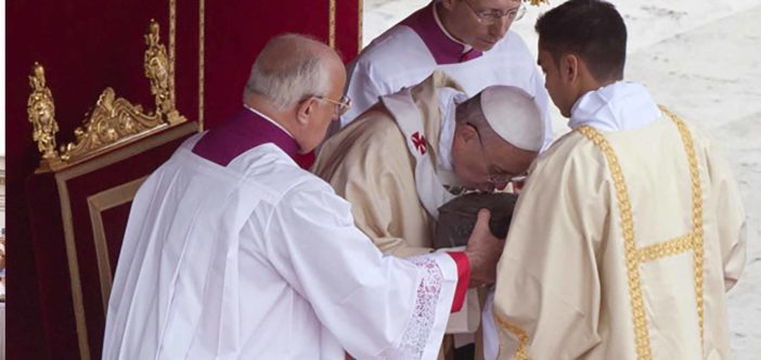 Đức Thánh Cha Phanxico hôn thánh tích của Thánh Tông đồ Phê-rô trên bàn thờ trong một Thánh Lễ tại Quảng trường Thánh Phê-rô ở Vatican