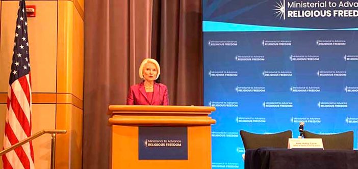 Bà đại sứ nói, “Mục tiêu nền tảng của hội nghị này chính là giải thoát cho thế giới khỏi sự bắt bớ và đàn áp tôn giáo. Hoa Kỳ cam kết mạnh mẽ trong nỗ lực này, và sẽ không bao giờ chấp nhận để cho người tín hữu bị bắt bớ, bị đàn áp, hoặc được khoan dung một cách đơn thuần bởi các chính phủ hoặc xã hội.