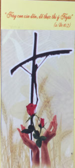 Chị Hùy gởi tặng em tấm ảnh nhỏ này, tấm ảnh ghi lời của Chúa: “Này con xin đến để thực thi ý Ngài.” (x.Dt 10,7) là điều em đã tâm niệm và đang sống. Dưới bóng Thánh giá là đôi bàn tay em đang giơ lên vừa hiến trao trong cầu nguyện, vừa dâng những thập giá của em như những bông hồng tình yêu em trao tặng lên Thầy Chí Thánh. Còn Chúa Giêsu từ trên Thánh Giá cũng đang nhìn xuống em với ánh mắt nhân hậu, yêu thương Ngài phấn khích em:“Cố lên Hằng ơi! Con là con yêu của Thầy, những khổ đau hôm nay sẽ là giá cho vinh quang mai sau của con trong Nước Cha Thầy. Cố lên Hằng, vì ngày hôm nay còn biết bao tâm hồn đang chờ lời cầu nguyện, sự hy sinh của con để đủ sức làm lại cuộc đời, quay về với Thầy. Cố lên Hằng, trong tình yêu hiến tế, không có gì là không có giá trị. Thầy vẫn ở đây, bên con để giúp con bền tâm, bền chí và bền đỗ nữa. Cố lên, cố lên!”