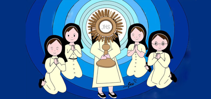 Ăn với uống là hai việc rất quan trọng đối với thân thể con người, vì đó là một nhu cầu hết sức cơ bản và cần thiết để nuôi sống cơ thể. Còn linh hồn thì sao? Lương thực nào có thể thỏa mãn cơn đói của linh hồn? Chỉ có thể là Bí Tích Thánh Thể. Thánh Thể chính là trung tâm của đời sống dâng hiến, là nguồn sức sống của toàn thể Giáo Hội và cách riêng đó là sự sống của bất cứ Hội dòng nào. Một cộng đoàn thiếu vắng Thánh Thể là cộng đoàn vắng bóng lửa yêu mến, trở nên lạnh lẽo tình người và như thế không thể đem lửa yêu mến của Thiên Chúa truyền đạt cho mọi người. Cảm nhận được sự quan trọng của Bí tích Thánh Thể nên hầu hết các cộng đoàn tu trì trong đó có Hội dòng chúng ta đều có các giờ chầu Thánh Thể chung cộng đoàn. Mỗi ngày viếng Thánh Thể một lần chung với chị em trong cộng đoàn là phương thế khôn ngoan để giúp cho mỗi thành viên hun đúc lại cuộc sống thánh hiến, là một đảm bảo an toàn và tăng thêm sức mạnh để chiến đấu. Hiểu được tầm quan trọng của giờ chầu Thánh Thể chung của cộng đoàn, linh mục Giuse Maria Nhân Tài có chia sẻ trong sách Nữ tu với Chúa Giêsu Thánh Thể như sau: “Toàn bộ Luật dòng là thân thể của dòng, nhưng luật quy định tham dự Thánh lễ và giờ chầu Thánh Thể là quả tim cho thân thể sống động và kết nối các phần tử trong thân thể với nhau nhờ ân sủng từ Thánh Thể thông ban. Do đó nếu mỗi phần tử trong cộng đoàn không yêu mến Chúa Giêsu Thánh Thể, thì không thể tiếp nhận đặc sủng từ Thánh Thể để chu toàn tốt bổn phận của một nữ tu”.