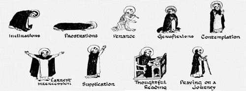 – Hai thể thức cuối cùng cũng góp phần vào việc cầu nguyện: ngồi để lắng nghe lời Chúa; đi để nhắc nhớ thân phận lữ hành (chẳng hạn như đi kiệu).