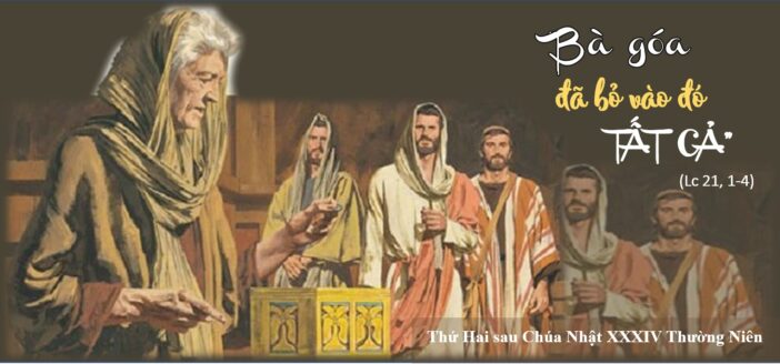Đức Giê-su nhìn thấy những người giàu bỏ tiền của họ vào thùng tiền ; và Ngài cũng thấy một bà góa túng thiếu bỏ vào đó hai đồng tiền kẽm, tương đương với 2 đồng tiền màu trắng 500 đồng, khi chúng ta còn dùng đồng tiền kim loại.