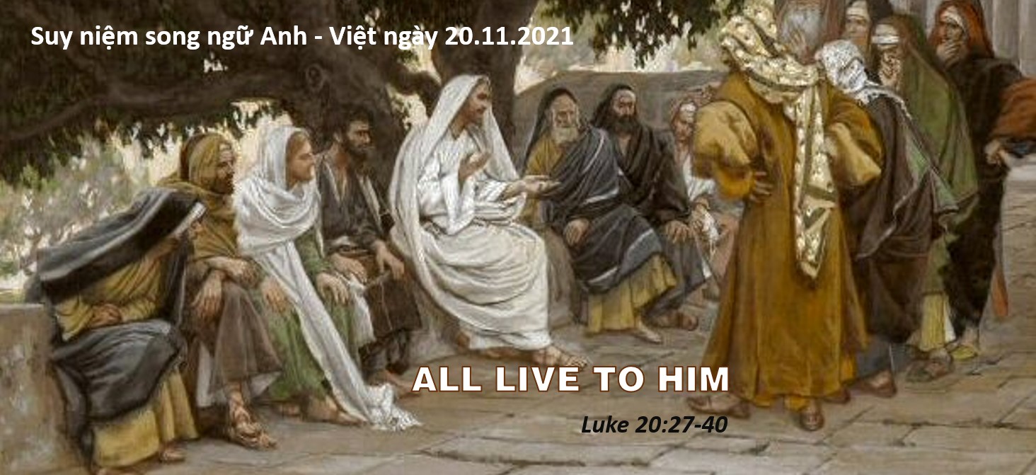 Saturday (Nov. 20, 2021): “All live to him” Scripture: Luke 20:27-40 27 There came to him some Sadducees, those who say that there is no resurrection, 28 and they asked him a question, saying, “Teacher, Moses wrote for us that if a man’s brother dies, having a wife but no children, the man must take the wife and raise up children for his brother. 29 Now there were seven brothers; the first took a wife, and died without children; 30 and the second 31 and the third took her, and likewise all seven left no children and died. 32 Afterward the woman also died. 33 In the resurrection, therefore, whose wife will the woman be? For the seven had her as wife.”34 And Jesus said to them, “The sons of this age marry and are given in marriage; 35 but those who are accounted worthy to attain to that age and to the resurrection from the dead neither marry nor are given in marriage, 36 for they cannot die any more, because they are equal to angels and are sons of God, being sons of the resurrection. 37 But that the dead are raised, even Moses showed, in the passage about the bush, where he calls the Lord the God of Abraham and the God of Isaac and the God of Jacob. 38 Now he is not God of the dead, but of the living; for all live to him.” 39 And some of the scribes answered, “Teacher, you have spoken well.” 40 For they no longer dared to ask him any question.