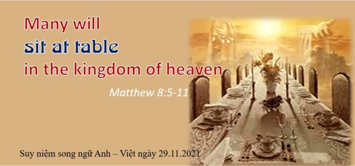 Monday (November 29) “Many will sit at table in the kingdom of heaven” Gospel Reading: Matthew 8:5-11 5 As he entered Capernaum, a centurion came forward to him, begging him 6 and saying, “Lord, my servant is lying paralyzed at home, in terrible distress.” 7 And he said to him, “I will come and heal him.” 8 But the centurion answered him, “Lord, I am not worthy to have you come under my roof; but only say the word, and my servant will be healed. 9 For I am a man under authority, with soldiers under me; and I say to one, `Go,’ and he goes, and to another, `Come,’ and he comes, and to my slave, `Do this,’ and he does it.” 10 When Jesus heard him, he marveled, and said to those who followed him, “Truly, I say to you, not even in Israel have I found such faith. 11 I tell you, many will come from east and west and sit at table with Abraham, Isaac, and Jacob in the kingdom of heaven