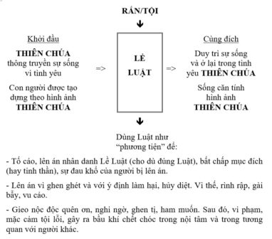 (2) Ngoài ra, loài người chúng ta, dưới sự mê hoặc của Sự Dữ, khi sống Lề Luật, đã cắt đứt Lề Luật ra khỏi nguồn gốc, là tương quan ơn huệ với Thiên Chúa, qua trung gian xã hội, Giáo Hội, Hội Dòng, gia đình… Hậu quả là, thay vì sống lề luật để bày tỏ lòng biết ơn, để lớn lên trong tương quan tình yêu nhưng không, trong tương quan giao ước, con người dựa vào chữ của lề luật để tạo lập sự công chính của mình; từ đó, sẽ dẫn đến thái độ kiêu ngạo và thú vui dò xét và lên án người khác. Đây chính là thái độ của những người Pha-ri-sêu, kinh sư và luật sĩ. Hoặc ngược lại, chúng ta sẽ không bao giờ cảm thấy mình “công chính”, khi đối diện với Lề Luật; vì thế, chúng ta luôn bị dày vò bởi mặc cảm tội lỗi. Chính Đức Ki-tô sẽ hoàn tất Lề Luật cách tận căn bằng Thập Giá, để trao ban cho chúng ta sự công chính của Ngài.