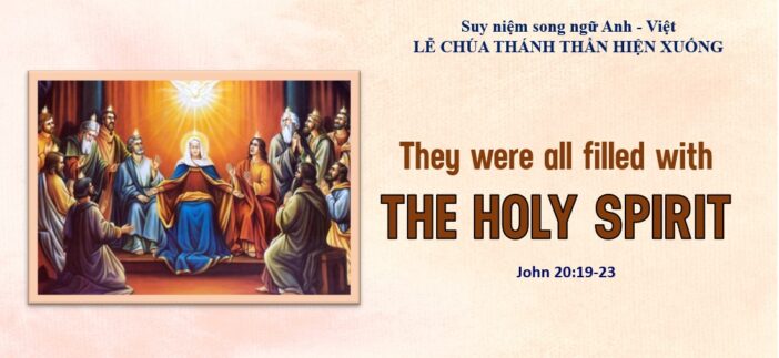 Chúa Nhật Lễ Chúa Thánh Thần Hiện Xuống ngày 05.6.2022 Tất cả đều được tràn đầy Chúa Thánh Thần Ga 20,19-23 19 Vào chiều ngày ấy, ngày thứ nhất trong tuần, nơi các môn đệ ở, các cửa đều đóng kín, vì các ông sợ người Do-thái. Đức Giê-su đến, đứng giữa các ông và nói: “Bình an cho anh em! “20 Nói xong, Người cho các ông xem tay và cạnh sườn. Các môn đệ vui mừng vì được thấy Chúa.21 Người lại nói với các ông: “Bình an cho anh em! Như Chúa Cha đã sai Thầy, thì Thầy cũng sai anh em.”22 Nói xong, Người thổi hơi vào các ông và bảo: “Anh em hãy nhận lấy Thánh Thần.23 Anh em tha tội cho ai, thì người ấy được tha; anh em cầm giữ ai, thì người ấy bị cầm giữ.” |