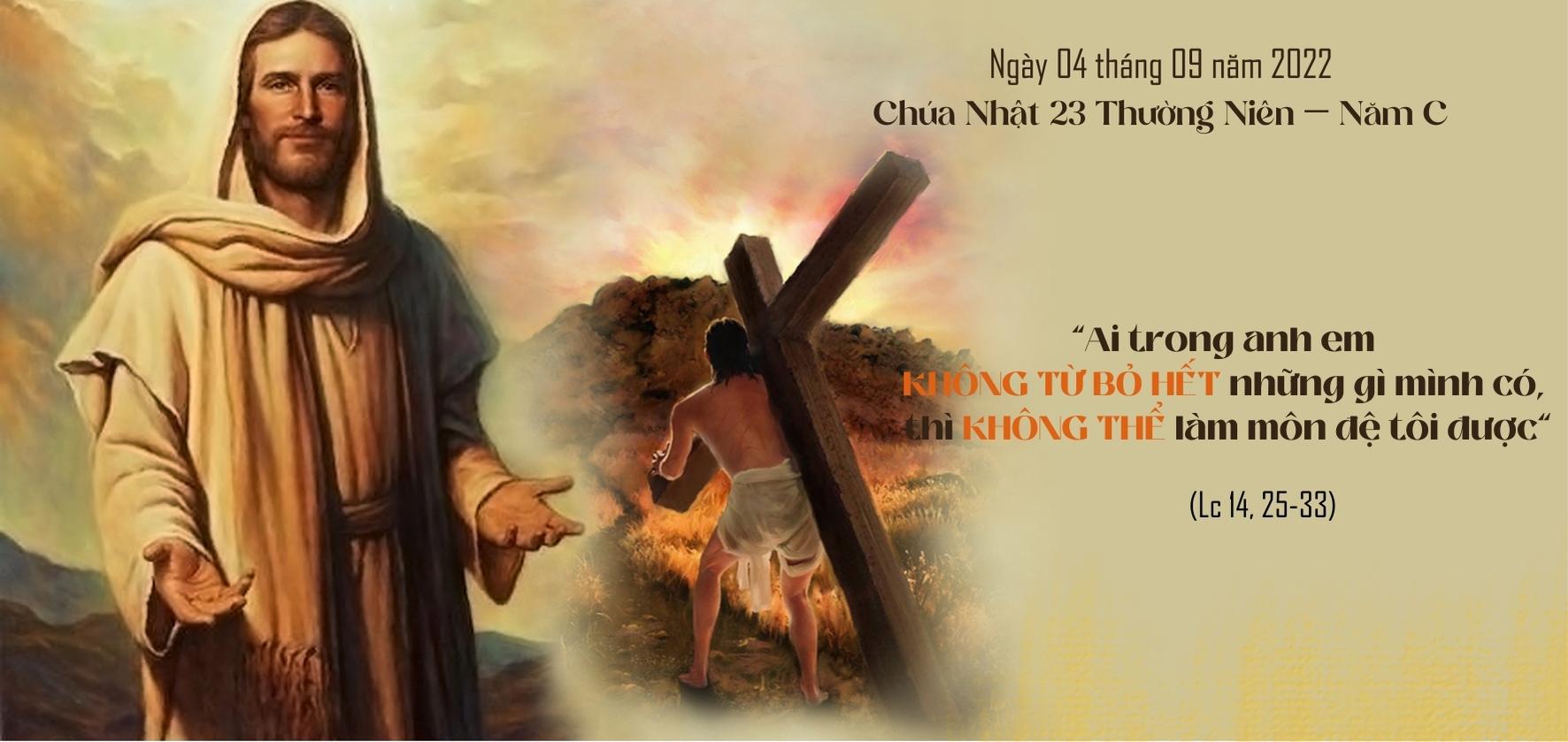 Để trở thành môn đệ của Người, Đức Giê-su đưa ra một đòi hỏi quá khó khăn. Vì thế, chúng ta thường hiểu đòi hỏi này chỉ dành cho một số ít người thôi, đó là các tông đồ, và bây giờ là những người đi tu! Hiểu như vậy có lẽ là không đúng, vì như chúng ta vừa nghe trong bài Tin Mừng, Đức Giê-su nói lời này với đám người rất đông đang cùng đi đường với Ngài; và trong Giáo Hội, dù lập gia đình hay đi tu, chúng ta đều là Ki-tô hữu, nghĩa là thuộc về Đức Ki-tô, chúng ta đều là môn đệ của Đức Ki-tô theo những cách thế khác nhau, trong đời sống hôn nhân hay đời sống tu trì. Hơn nữa, trong lời mời gọi từ bỏ, Đức Giê-su có nêu ra “vợ con”, nghĩa là Ngài ngỏ lời với cả những người đã có gia đình, đã có vợ có chồng và đã cả con cái!