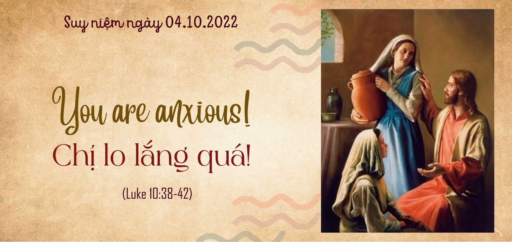 Tuesday, October 4, 2022 You Are Anxious Scripture: Luke 10:38-42 38 Now as they went on their way, he entered a village; and a woman named Martha received him into her house. 39 And she had a sister called Mary, who sat at the Lord’s feet and listened to his teaching. 40 But Martha was distracted with much serving; and she went to him and said, “Lord, do you not care that my sister has left me to serve alone? Tell her then to help me.” 41 But the Lord answered her, “Martha, Martha, you are anxious and troubled about many things; 42 one thing is needful. Mary has chosen the good portion, which shall not be taken away from her.” |