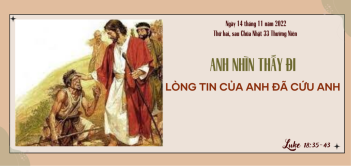 38 Anh liền kêu lên rằng: “Lạy ông Giê-su, Con vua Đa-vít, xin dủ lòng thương tôi! “39 Những người đi đầu quát nạt, bảo anh ta im đi; nhưng anh càng kêu lớn tiếng: “Lạy Con vua Đa-vít, xin dủ lòng thương tôi! “40 Đức Giê-su dừng lại, truyền dẫn anh ta đến. Khi anh đã đến gần, Người hỏi:41 “Anh muốn tôi làm gì cho anh? ” Anh ta đáp: “Lạy Ngài, xin cho tôi nhìn thấy được.”42 Đức Giê-su nói: “Anh nhìn thấy đi! Lòng tin của anh đã cứu chữa anh.”