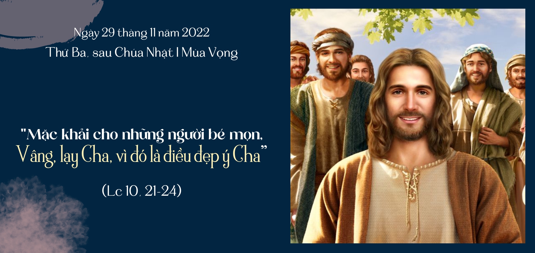 Ngay giờ ấy, được Thánh Thần tác động, Đức Giê-su hớn hở vui mừng và nói: “Lạy Cha là Chúa Tể trời đất, con xin ngợi khen Cha, vì Cha đã giấu kín không cho bậc khôn ngoan thông thái biết những điều này, nhưng lại mặc khải cho những người bé mọn. Vâng, lạy Cha, vì đó là điều đẹp ý Cha”. (c. 21-22)
