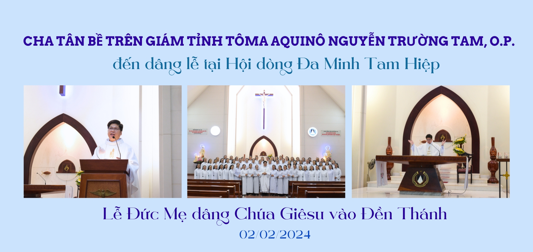 Từ phiên bầu cử Bề trên Giám tỉnh ngày 06/12/2023 tại Tỉnh Hội Biên Hòa 2023 và với văn thư chuẩn nhận của Bề trên Tổng quyền được công bố ngày 06/12/2023, cha Tôma Aquinô Nguyễn Trường Tam, O.P. đã chính thức đảm nhận vai trò Giám tỉnh Tỉnh dòng Đa Minh Việt Nam nhiệm kỳ II, 2023-2027. Và, sáng ngày 02/02/2024, cha Tôma Aquinô đã đến thăm và dâng lễ tại nguyện đường Hội dòng trong tư cách là Bề trên Giám Tỉnh.
