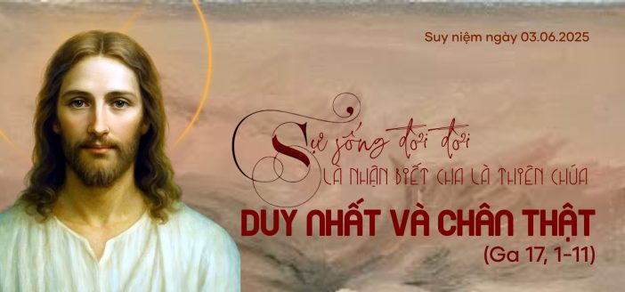 Trong bài diễn từ tiệc ly cuối cùng, Đức Giêsu nói về vinh quang của Người và vinh quang của Cha. Vinh quang này là gì? Chính là thập giá mà Đức Giêsu nói ở đây và việc tự nguyện hiến tế đời Người cho chúng ta. Làm thế nào thập giá bày tỏ vinh quang của Người? Trong thập giá, Thiên Chúa mặc khải chiều rộng tình yêu lớn lao của Người dành cho các tội nhân và quyền năng cứu độ mà xóa bỏ món nợ tội lỗi và đảo lộn lời chúc dữ án tội của chúng ta (Rm 8,1). Đức Giêsu đã dâng tiến Cha vinh dự và vinh quang lớn nhất ngang qua sự vâng phục và sự tự nguyện của mình để đi tới thập giá vì chúng ta. Trong chiến trường, vinh dự lớn nhất không thuộc về những ai chiến đấu và còn sống sót, nhưng thuộc về những ai đã hy sinh cao độ, dâng hiến chính mạng sống của mình cho đồng bào của mình. Chúa Giêsu sẵn sàng tự nguyện dâng hiến mạng sống mình vì vâng phục Cha và vì tình yêu dành cho chúng ta. Đức Giêsu mặc khải vinh quang THIÊN CHÚA cho cta Đức Giêsu cũng nói về Cha, mang lại vinh quang cho Con ngang qua mầu nhiệm Nhập thể cao cả – Ngôi Lời vĩnh cửu đã mặc lấy xác phàm vì chúng ta (Ga 1,14) – và Thập giá của Đức Kitô, đã đem lại cho chúng ta ơn tha thứ, giải thoát, và sự sống mới trong Chúa Thánh Thần. Chúa Cha ban cho chúng ta Con một yêu dấu của mình để giải thoát chúng ta khỏi sự nô lệ tội lỗi, sai lạc, và hình phạt. Cái chết hy sinh của Người đem lại cho chúng ta sự sống mới – sự sống sung mãn của bình an và niềm vui mà Thiên Chúa muốn chia sẻ với mỗi một người chúng ta. Không có bằng chứng nào lớn hơn về tình yêu của Thiên Chúa dành cho mỗi một người trên trái đất này hơn Thập giá Đức Giêsu Kitô. Trong thập giá, chúng ta nhìn thấy con đường tình yêu mới – tình yêu với lòng thương xót, hy sinh, quảng đại, vượt trên sự hiểu biết. Đức Giêsu đề cử sự sống sung mãn bất diệt Đức Giêsu ban cho chúng ta sự sống đời đời. Sự sống đời đời là gì? Nó còn hơn sự đơn giản một cuộc sống bất tận hay một trạng thái hiện hữu vĩnh cửu. Khoa học và y khoa tìm kiếm những cách thức để kéo dài sự sống – nhưng Thiên Chúa ban cho chúng ta điều gì đó còn lớn lao và vượt trổi hơn cả sự kéo dài sự sống thể lý. Sự sống đời đời là phẩm chất hơn cả số lượng. Để có được sự sống đời đời thì phải có sự sống thật của Thiên Chúa trong chúng ta. Khi chúng ta có được sự sống đời đời, chúng ta cảm nghiệm ở đây, và bây giờ điều gì đó về uy quyền, vinh quang, và thánh thiện của Thiên Chúa mà Người chia sẻ với chúng ta. Ngang qua ân huệ và hoạt động của Chúa Thánh Thần, Thiên Chúa lấp đầy chúng ta với hoa trái dư dật của sự bình an, niềm vui và tình yêu của Người. Chúng ta có thể biết Thiên Chúa cách cá vị Đức Giêsu cũng nói về sự hiểu biết về Thiên Chúa. Đức Giêsu nói với các môn đệ rằng họ có thể hiểu biết Thiên Chúa chân thật và duy nhất. Sự hiểu biết về Thiên Chúa không đơn giản giới hạn hiểu biết điều gì đó về Thiên Chúa – nhưng chúng ta có thể hiểu biết chính Thiên Chúa và hiệp nhất với Thiên Chúa trong mối quan hệ cá vị của tình yêu và tình bằng hữu. Bản chất của đạo Công giáo và những gì làm cho nó khác biệt với đạo Dothái và những tôn giáo khác, là sự hiểu biết cá vị và cảm nghiệm về Thiên Chúa, là Cha vĩnh cửu chúng ta – Đấng hiểu biết chúng ta trước khi tạo dựng (Ep 1,4; Rm 8,29) và Đấng và gắn kết chúng ta trong bụng dạ của thân mẫu chúng ta (Tv 139,13; Gr 1,5). Đức Giêsu cho phép mỗi người chúng ta biết Thiên Chúa là Cha của chính mình. Xem thấy Đức Giêsu tức là xem thấy Thiên Chúa. Tình yêu đơn nhất tồn tại mãi mãi Nơi Đức Giêsu, chúng ta nhìn thấy tình yêu hoàn hảo của Thiên Chúa – một Thiên Chúa quan tâm săn sóc và yêu thương mọi người nam nữ, yêu thương họ đến nỗi hiến mạng sống mình vì họ trên thập giá. Đức Giêsu là sự mặc khải của Thiên Chúa – một Thiên Chúa hoàn toàn yêu thương chúng ta, vô điều kiện và tuyệt hảo. Bạn có đói khát sự hiểu biết Thiên Chúa cách cá vị và được kết hiệp với Cha nơi Con của Người, là Chúa Giêsu Kitô, qua sự hiệp nhất với Chúa Thánh Thần, Đấng ở cùng chúng ta không? Chúa Giêsu mời gọi mỗi người chúng ta đi sâu vào mối quan hệ cá vị của tình yêu và tính duy nhất của tâm hồn, lý trí, và ý chí với Cha vĩnh cửu, với Con, và với Chúa Thánh Thần, Đấng đã tạo dựng nên chúng ta trong tình yêu và vì tình yêu. Lạy Chúa Giêsu tốt lành, phải chi con chỉ chiếm hữu ơn sủng, để hoàn toàn nên một với Chúa! Lạy Chúa, giữa tất cả trạng thái khác nhau của những sự trần thế xung quanh con, điều duy nhất con khao khát là nên một với Chúa. Chúa là tất cả những gì linh hồn con cần đến. Ôi, người bạn đáng mến của lòng con, xin kết hợp linh hồn đơn nhất này của con vào sự tốt lành hoàn hảo của Chúa. Chúa là tất cả của c