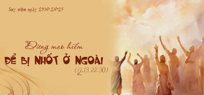 Đừng mạo hiểm để bị nhốt ở ngoài Lc 13, 22-30 (22) Trên đường lên Giêrusalem, Ðức Giêsu đi ngang qua các thành thị và làng mạc mà giảng dạy. (23) Có kẻ hỏi Người: “Thưa Ngài, những người được cứu thoát thì ít, có phải không?” Người bảo họ: (24) “Hãy chiến đấu để qua được cửa hẹp mà vào, vì tôi nói cho anh em biết: có nhiều người sẽ tìm cách vào mà không thể được.(25) “Một khi chủ nhà đã đứng dậy và khoá cửa lại, mà anh em còn đứng ở ngoài, bắt đầu gõ cửa và nói: “Thưa ngài, xin mở cho chúng tôi vào!”, thì ông sẽ bảo anh em: “Các anh đấy ư? Ta không biết các anh từ đâu đến!” (26) Bấy giờ anh em mới nói: “Chúng tôi đã từng được ăn uống trước mặt ngài, và ngài cũng đã từng giảng dạy trên các đường phố của chúng tôi”. (27) Nhưng ông sẽ đáp với anh em: “Ta không biết các anh từ đâu đến. Cút đi cho khuất mắt ta, hỡi tất cả những quân làm điều bất chính!”.(28) “Bấy giờ anh em sẽ khóc lóc nghiến răng, khi thấy các ông Ápraham, Ixaác và Giacóp cùng tất cả các ngôn sứ được ở trong Nước Thiên Chúa, còn mình lại bị đuổi ra ngoài. (29) Thiên hạ sẽ từ đông tây nam bắc đến dự tiệc trong Nước Thiên Chúa.(30) “Và kìa có những kẻ đứng chót sẽ lên hàng đầu, và có những kẻ đứng đầu sẽ xuống hàng chót”. |