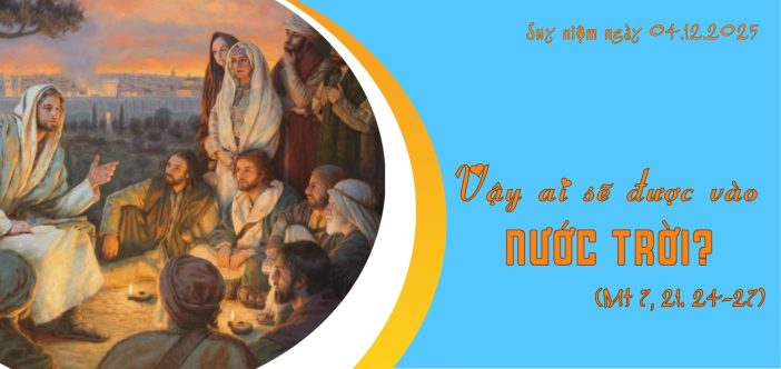 Vậy ai sẽ được vào nước Trời? Mt 7, 21. 24-27 21 “Không phải bất cứ ai thưa với Thầy: “Lạy Chúa! lạy Chúa! ” là được vào Nước Trời cả đâu! Nhưng chỉ ai thi hành ý muốn của Cha Thầy là Đấng ngự trên trời, mới được vào mà thôi.24 “Vậy ai nghe những lời Thầy nói đây mà đem ra thực hành, thì ví được như người khôn xây nhà trên đá.25 Dù mưa sa, nước cuốn, hay bão táp ập vào, nhà ấy cũng không sụp đổ, vì đã xây trên nền đá.26 Còn ai nghe những lời Thầy nói đây, mà chẳng đem ra thực hành, thì ví được như người ngu dại xây nhà trên cát.27 Gặp mưa sa, nước cuốn hay bão táp ập vào, nhà ấy sẽ sụp đổ, sụp đổ tan tành”. |